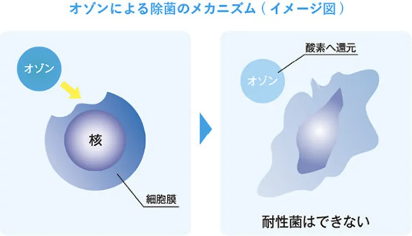 「オゾン水」とは、その名の通り酸素の同位体であるオゾンが溶け込んだ水のこと。オゾンには酸化する力があり、除菌、有機物分解の作用があるとされる物質。強い除菌性能も認められています。オゾン水による除菌は他の薬剤による除菌と違い「耐性菌」をつくりません。菌に厳しくも、水由来だから人にはやさしく、安全な除菌剤として期待されています。