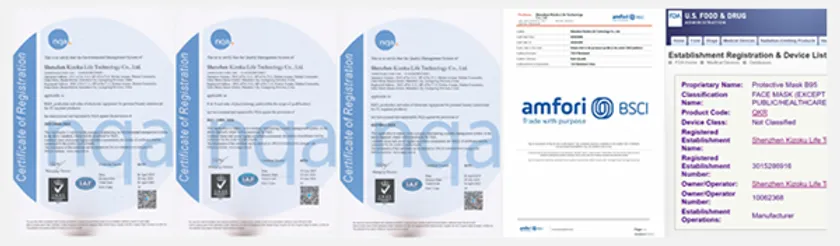 ■ISO 9001/14001/13485、FDA、BSCI認証を取得したメーカーの管理された工場で製造されていますので、より品質のよいマスクを製造しています。
