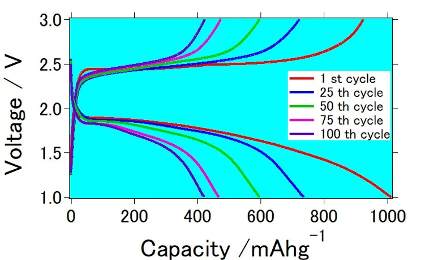 開発したリチウム硫黄電池の充放電曲線