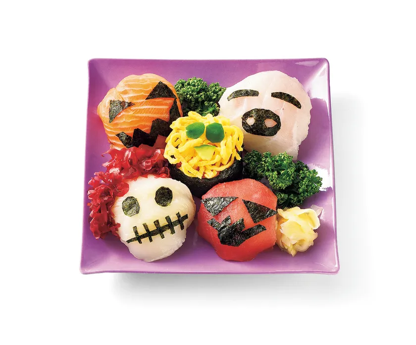 サーモンの手まり寿司でジャック・オ・ランタン、魚介や錦糸玉子でおばけを表現。