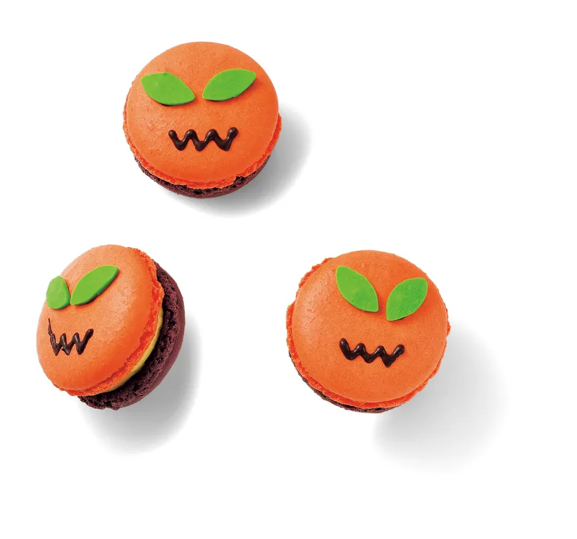 かぼちゃプリンをイメージし、シナモン風味のかぼちゃ味のバタークリームを絞った生マカロン。