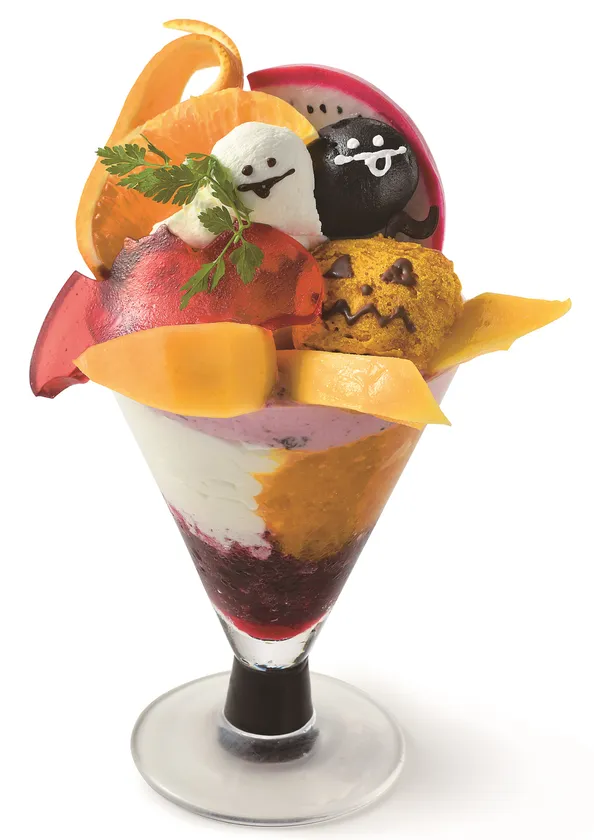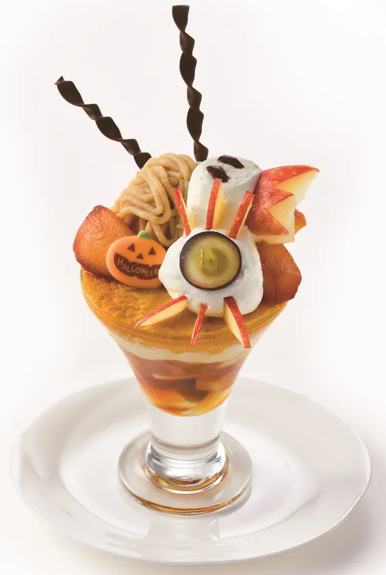 カラメルで煮たりんごをかぼちゃのクリームやおばけの飾りと共にハロウィン仕立てにしたパフェ。