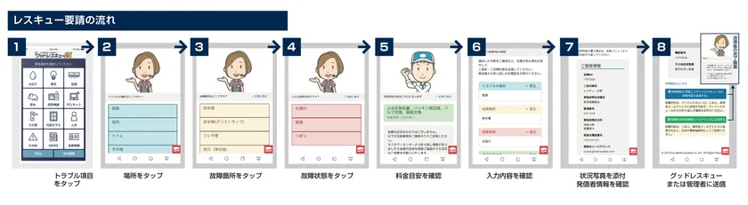 店舗の緊急依頼方法の現在の問題点は電話で時間がかかること。グッドレスキュー24のアプリ・システムでの依頼は、銀行のATM感覚で、場所・箇所・状態等3つの質問に対し該当する答えを選択するだけで、設備等の知識がない方でも簡単に的確に早く依頼することが可能です(24時間365日全国対応)。また予想施工内容と料金目安も同時に確認ができ、施工業者からの不正請求の防止にも役立ちます。