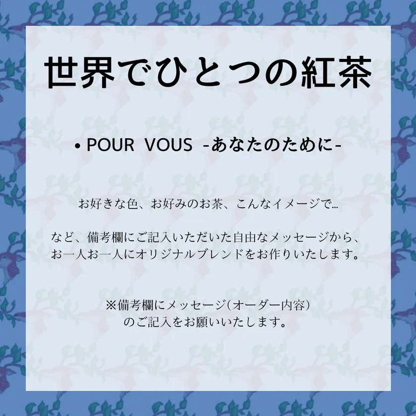 お茶のお好み、好きな色、ご自身についてや“こんな時に飲めるお茶!”などの抽象的なオーダーでも。大切な方をイメージした贈り物用としてもご好評いただいています。