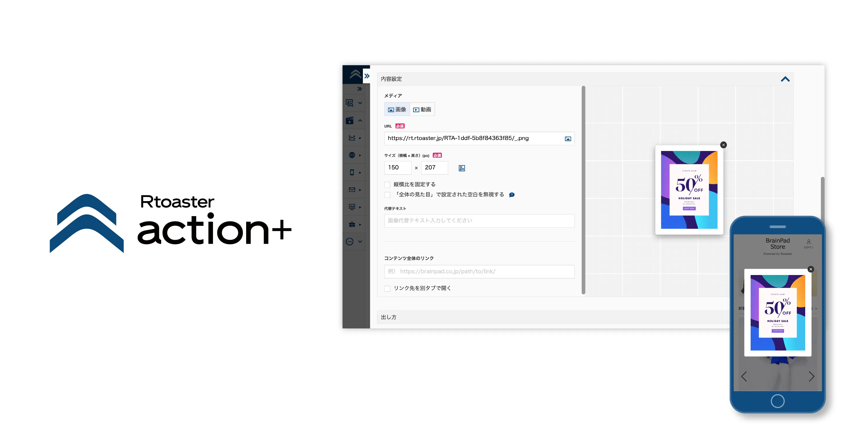 「Rtoaster action+」は、多様化する顧客・消費者のニーズを捉え、自然な行動を促すために、蓄積されたビックデータと機械学習アルゴリズムを用いて、顧客へのアプローチをパーソナライズする最適化プラットフォームです。ウェブサイトにおける精度の高いレコメンドや接客はもちろん、顧客行動・購買データの収集・スコアリング、データに基づくパーソナライズをタグ1つで行うことが可能です。