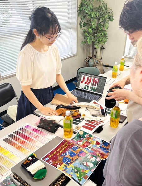大学内でのテーマプレゼンテーションやキャンペーンノベルティ制作の靴下メーカーとの打ち合わせの様子