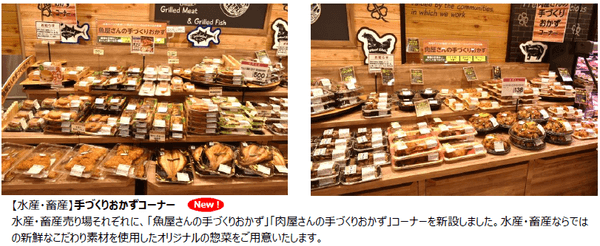 この度の改装で、地下1階の食品フロアを中心に床・内装・商品ケースを一新し、お買い物しやすい売り場に生まれ変わりました。「魚屋さんの手づくりおかず」・「肉屋さんの手づくりおかず」などの素材にこだわった魚・肉惣菜コーナーの新設や農産売り場の店内手作りサラダ、冷凍食品など、即食・簡便商品を種類豊富に取りそろえ、お客様にご満足いただけるお店を実現いたします。