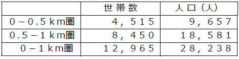 ・店舗から1km圏内は単身世帯比率が39.9%、2人世帯比率は25.5%と全体の7割が少人数世帯です。