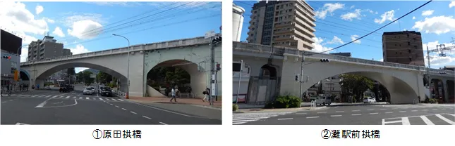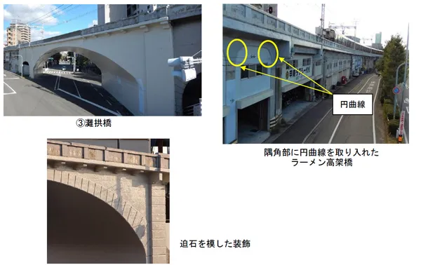 この高架橋のうち、3か所のアーチ橋部分(原田拱橋(きょうきょう)・灘駅前拱橋・灘拱橋)は、幹線道路との交差部において優美な景観とすべく採用されたものですが、道路と斜交しているため、ねじれて見えるのが特徴で、迫石(せりいし)を模した装飾を施すなど、細部に行き届いた配慮を施しています。その他のラーメン高架橋についても、高架下の利用に配慮しつつ、隅角(ぐうかく)部に円曲線を取り入れるなど、洗練された設計となっています。