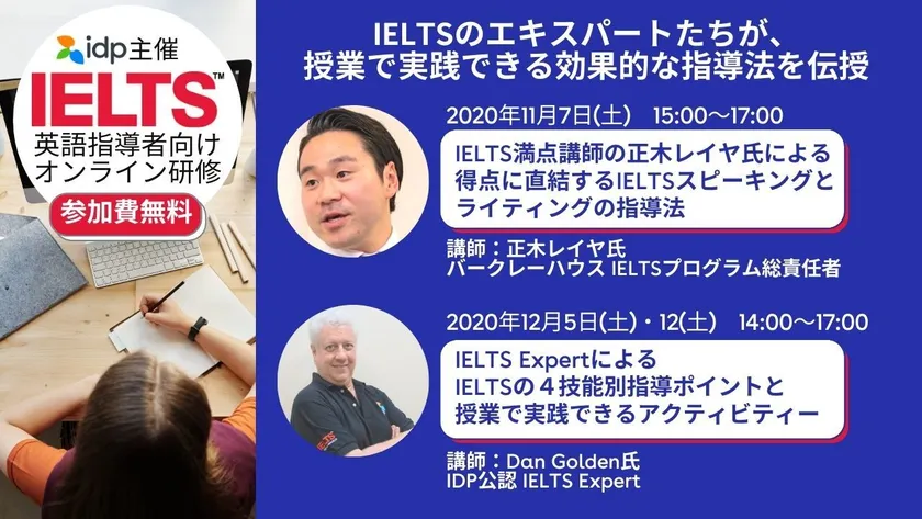 今回の研修プログラムは、IELTSに精通した日本人とネイティブのエキスパートを講師に迎え、11月7日(土)、12月5日(土)、12月12日(土)の3日間に渡ってオンライン形態で開催します。IELTS指導を始めたばかりの方から、ご自身の指導スキルをブラッシュアップしたいという経験者まで幅広い方々に研修に参加して頂き、現場でお役立て頂ける内容となっています。当社は今後も指導者の支援や育成を通じ、日本国内におけるIELTSの普及に努めて参ります。