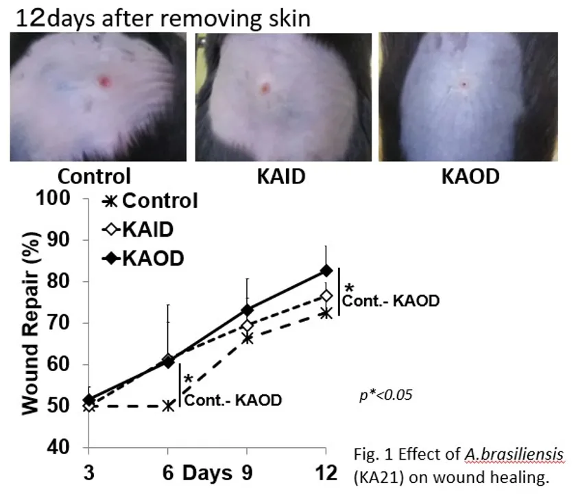 露地栽培アガリクス(KA21株)の摂取は、術後の腫れなどに影響を与えることなく、コラーゲンやTGF-βの合成促進を介した創傷面の治癒促進が確認されたことから、美容手術後の早期回復用サプリメントとしての応用が期待される。