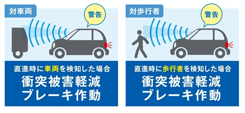前方監視装置(ミリ波レーダーと単眼カメラ)が進路上の車両や歩行者を認識、衝突の恐れがあるときに、ブザー音と黄色ランプ点滅による警告でドライバーに衝突回避を促します。