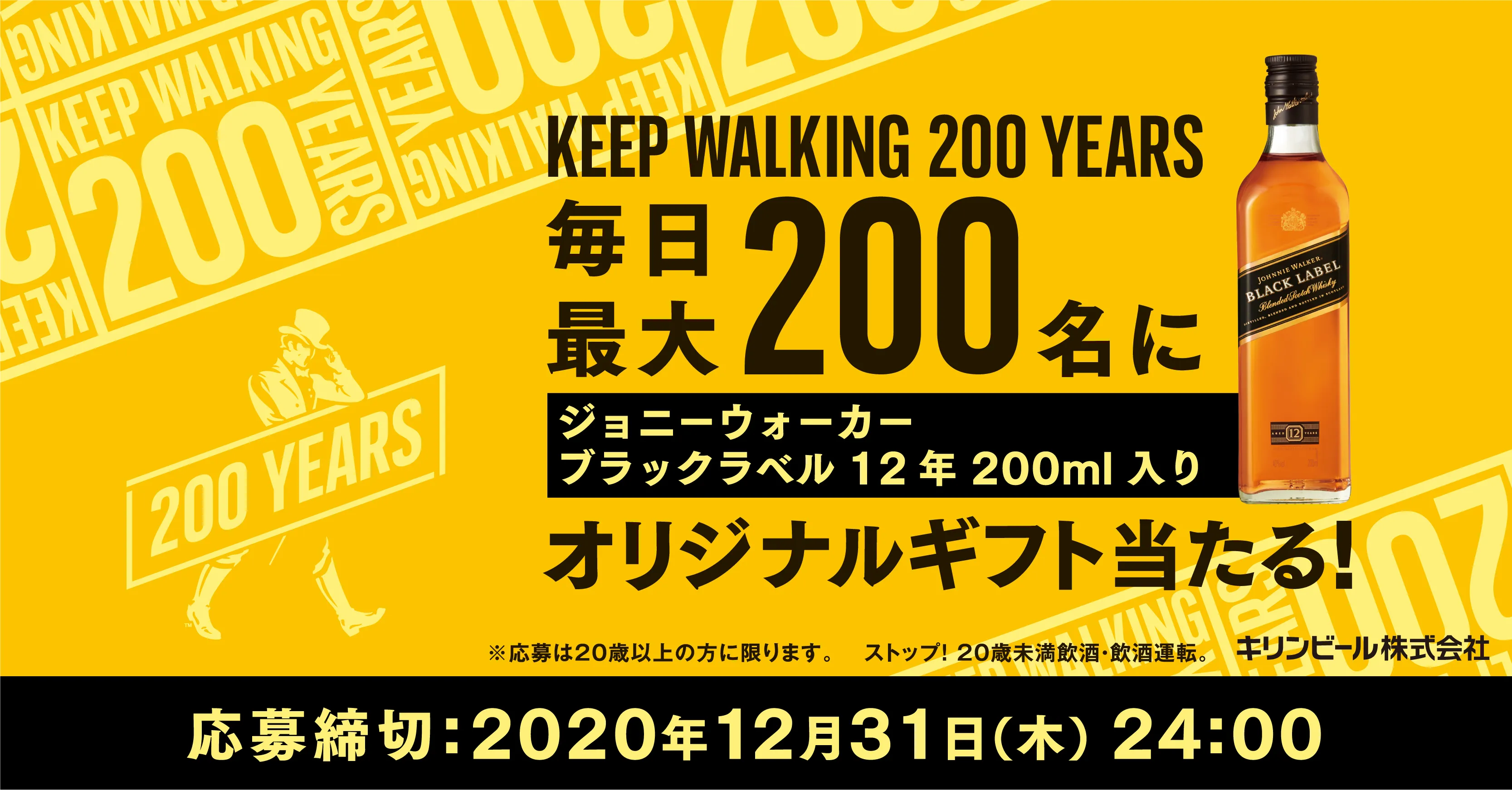 “KEEP WALKING 200 YEARS” キャンペーンの第一弾として、10月8日(木)から12月31日(木)までの期間に、「ジョニーウォーカー ブラックラベル 12年」のミニボトル(200ml)1本入りのオリジナルボックスが抽選で毎日最大200名様(最大総計約1万7千名様)に当たるTwitter プレゼント企画「”KEEP WALKING 200 YEARS” オリジナルギフトキャンペーン」を実施します。