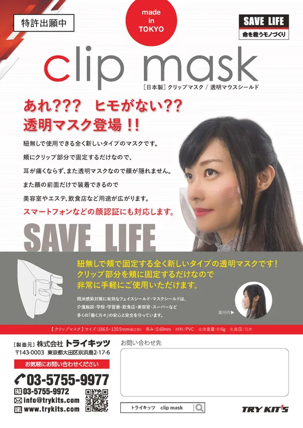 株式会社トライキッツ(本社:東京都大田区、代表取締役:河合 広介、以下 トライキッツ)は、表情が良く見える透明マスク「clip mask」を、2020年11月1日(予定)から販売開始いたします。