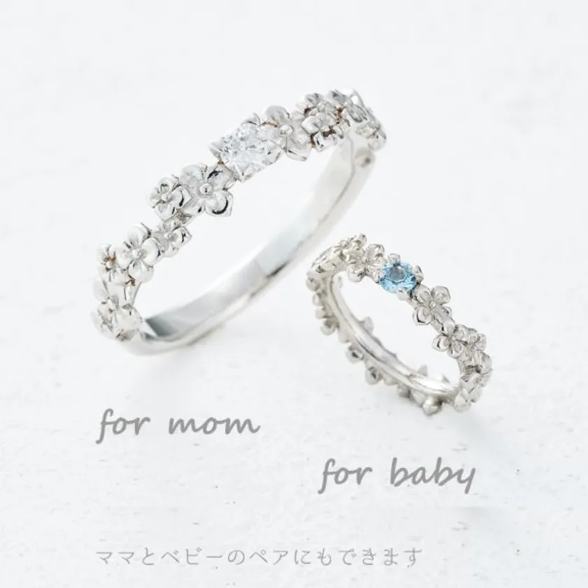 花が一周囲むベビーリングは他にはないデザイン。細やかな職人技だからこそできるデザインとつくりです。