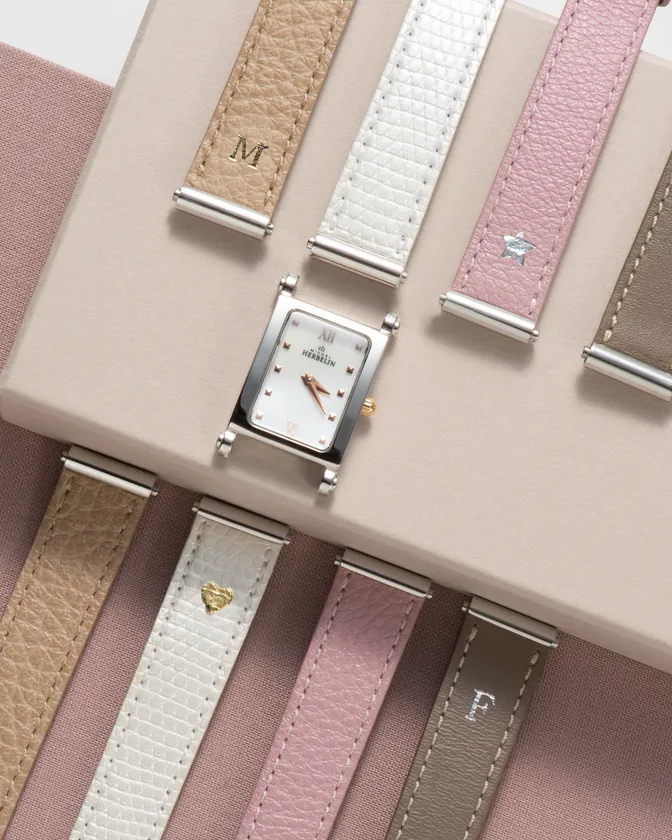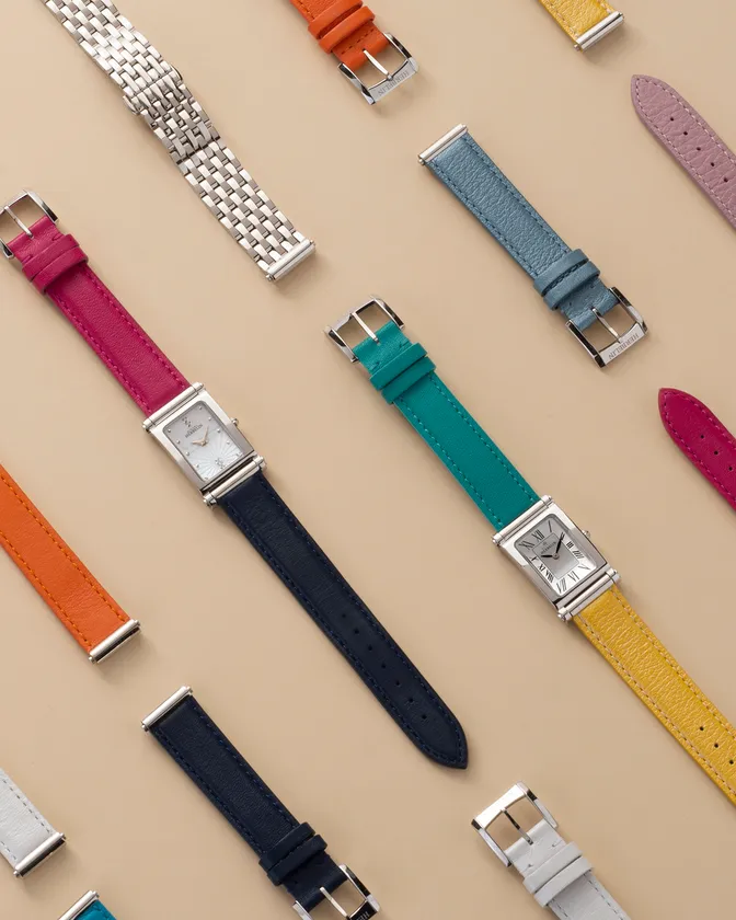 時計本体にSSコンビブレスとレザーストラップ2本が付属しており、2本のレザーストラップは、お好きな色のシングル・ロングストラップを21種類のラインナップの中から各1本ずつ選べます。(ロングストラップはシングルストラップに変更することもできます。)また、ストラップは毎年新作が発売され、追加でお買い足しいただくことができます。