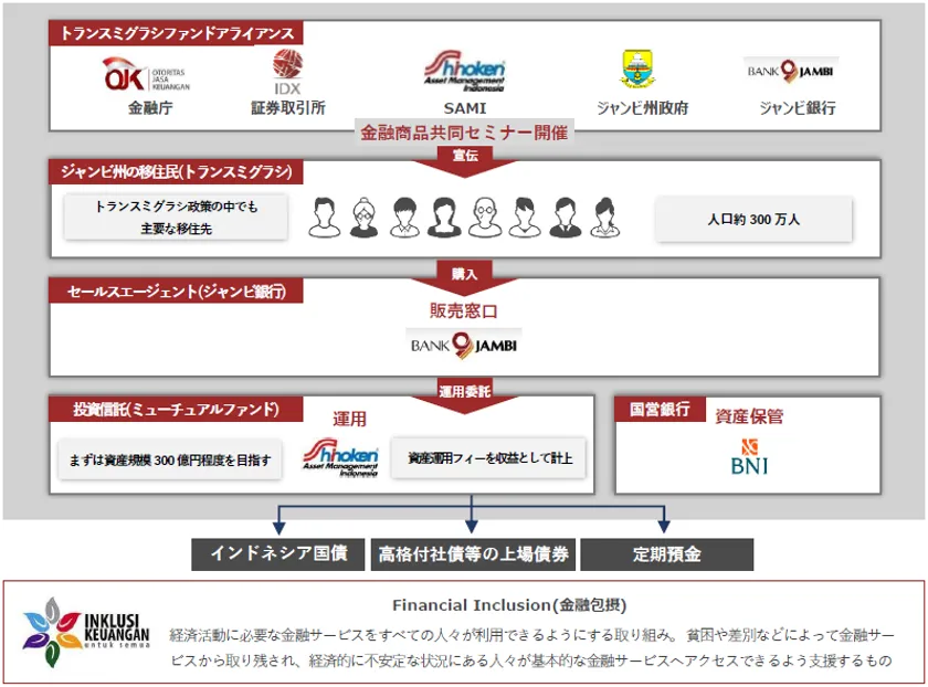 トランスミグラシ政策の中でも主要な移住先であるスマトラ島中央部のジャンビ州は、約300万人の人口を有し、パームオイル等の産業が盛んに行われており、比較的収入は安定している一方、金融サービスが未だ十分に行き届いていない地域でもあります。SAMIは、この地域に着目し、金融商品・サービスに触れる機会の無いインドネシア国民に金融サービスを行き届かせることを目的とし、インドネシア金融庁(Otoritas Jasa Keuangan)へ本ファンドの組成を申請し、承認を受けました。SAMIが主導しながら、インドネシア政府・証券取引所・州政府・国営銀行・地場金融機関の連携で個人向けに金融商品を販売するという、トランスミグラシ(移住民)向けとしてはインドネシア初のスキームが誕生することとなります。このスキームは、全ての人々が基本的な金融サービスを受けられるようにする「ファイナンシャル・インクルージョン(金融包摂)」という社会的意義の高いものとなります。本ファンドの資産規模としては、まず300億円程度を目指し、その後、更に拡大させていくことを予定しております。SAMIは運用を担当し、資産運用フィーを収益として計上することを見込みます。