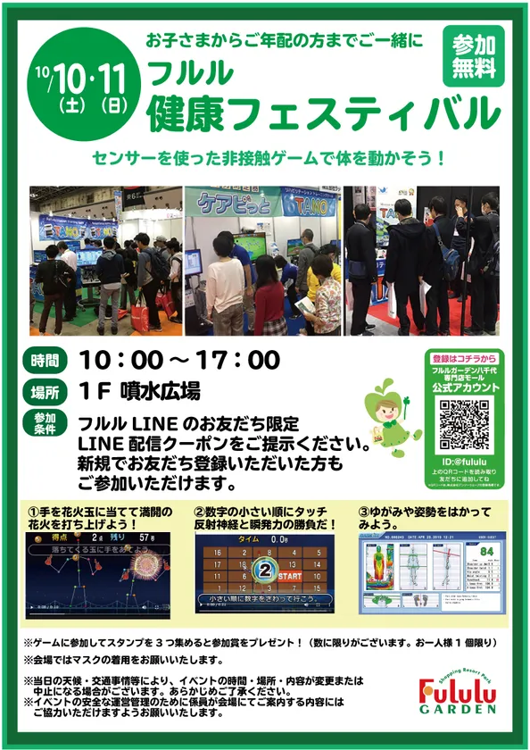 (2)フルルガーデン八千代(千葉県・八千代市)にて10月10・11日の二日間「フルル 健康フェスティバル センサーを使った非接触ゲームで体を動かそう!」が開催されます。TANOを直接体験していただくことができます。