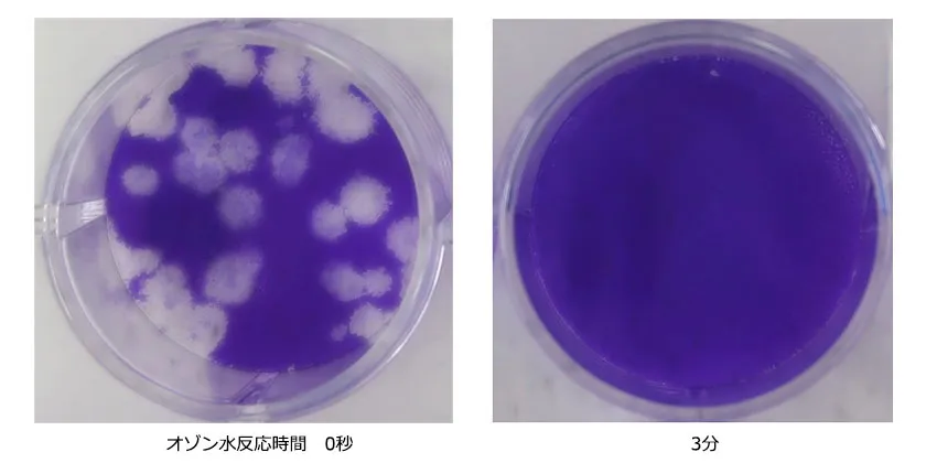 新型コロナウイルス液をシャーレーに塗抹し、オゾン水ミストを2回噴霧をして、15秒、60秒、3分の反応後、チオ硫酸ナトリウム混合回収液で反応を停止後、ウイルス感染価をプラーク法で測定した。(各工程2回ずつ実施)