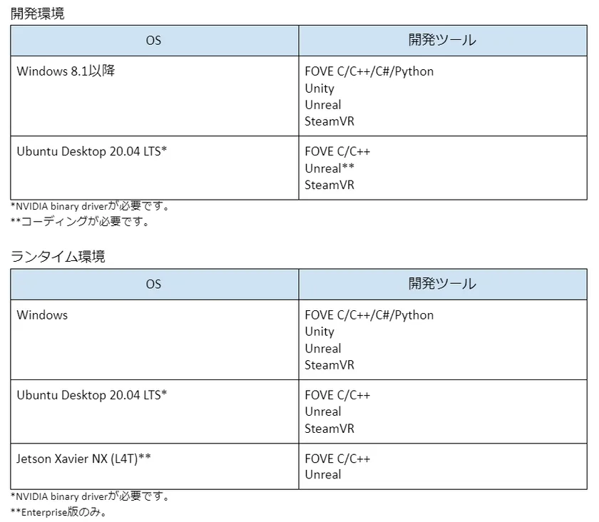 FOVE VR Platformの開発環境・ランタイム環境は以下の通りです。