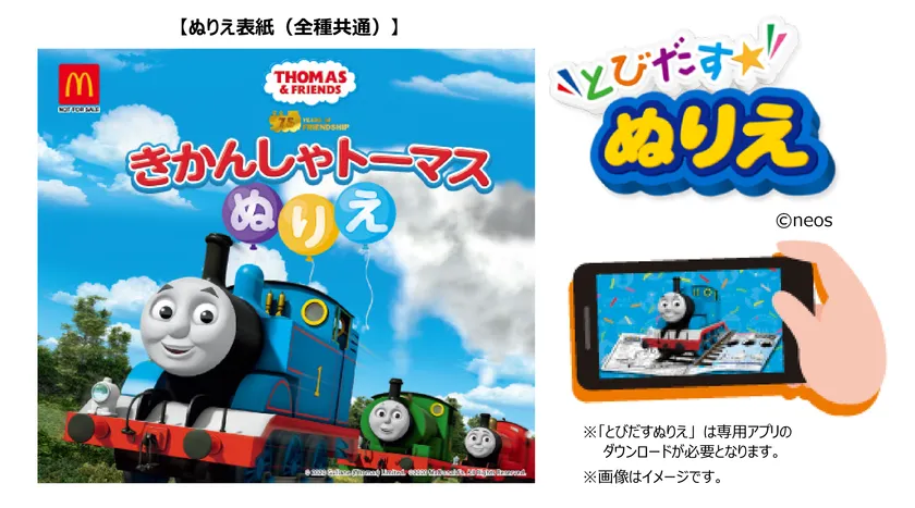 ハッピーセット「きかんしゃトーマス」には、トーマスやパーシー、ゴードンなど人気のキャラクター達のぬりえ5種が揃います。ミニクイズやキャラクター紹介なども収録されており、大好きなトーマスや仲間達と一緒に自由に楽しく遊べる内容です。ぬりえのうち1ページはアプリ「とびだすぬりえ」に対応しており、アプリでカメラを起動してぬりえにかざすと、自分で色を塗ったトーマスが立体的に飛び出し、画面上で走り出します。さらに、アプリ内の「ひろば」では、自分で自由に描いた線に沿ってトーマス達を走らせることもできます。子ども達の想像力や表現力を育むぬりえやクイズを、思い思いの遊び方でお楽しみください。