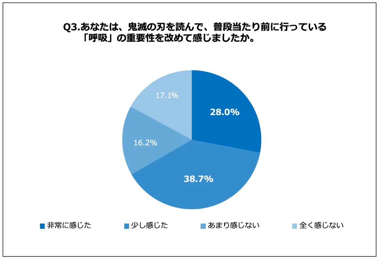 「Q3.あなたは、鬼滅の刃を読んで、普段当たり前に行っている「呼吸」の重要性を改めて感じましたか。」(n=111)と質問したところ、「非常に感じた」が28.0%、「少し感じた」が38.7%という回答となりました。