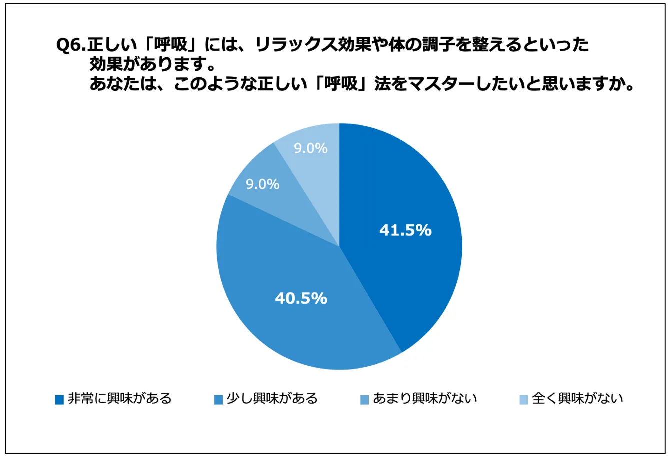 「Q6.正しい「呼吸」には、リラックス効果や体の調子を整えるといった効果があります。あなたは、このような正しい「呼吸」法をマスターしたいと思いますか。」(n=111)と質問したところ、「非常に興味がある」が41.5%、「少し興味がある」が40.5%という回答となりました。