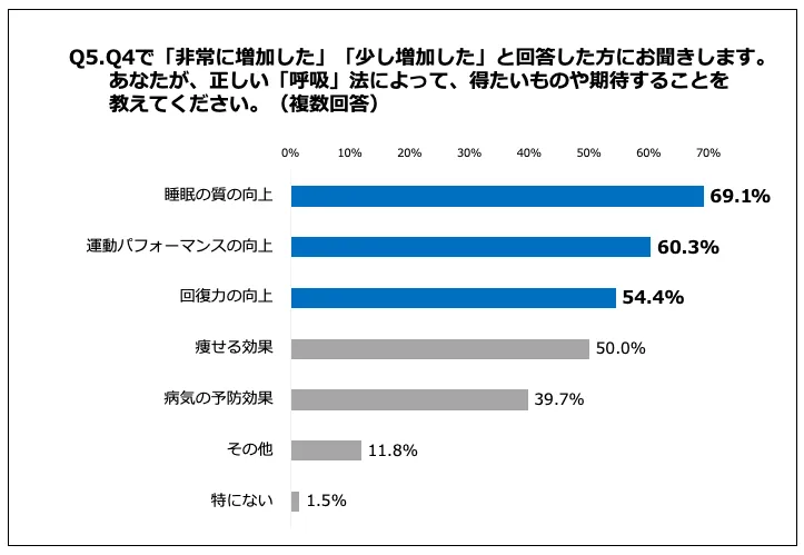 Q4で「非常に増加した」「少し増加した」と回答した方に「Q5.あなたが、正しい「呼吸」法によって、得たいものや期待することを教えてください。(複数回答)」(n=68)と質問したところ、「睡眠の質の向上」が69.1%、「運動パフォーマンスの向上」が60.3%、「回復力の向上」が54.4%という回答となりました。