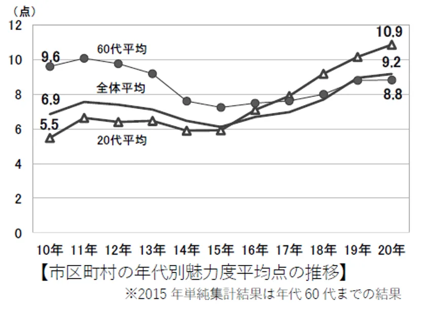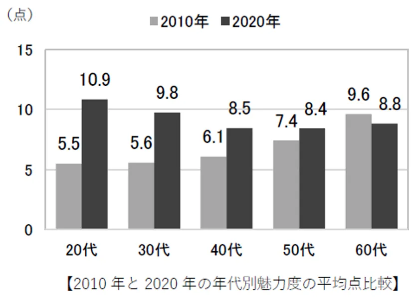 2010年と2020年を比較すると、60代を除きすべての年代で魅力度の平均点が上昇している。特に20代、30代の上昇が大きく、2020年では若年層ほど各地域に対して“魅力的”と回答する傾向に変化している。