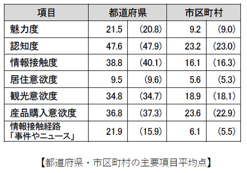 他方、魅力度をはじめとする主要な調査項目の平均点は前年からほぼ横ばい、また項目によっては若干上昇している。全体的には接触した情報に変化はあったが、各地域への居住意欲、観光意欲といった行動意欲に大きな変化はないという結果となっている。
