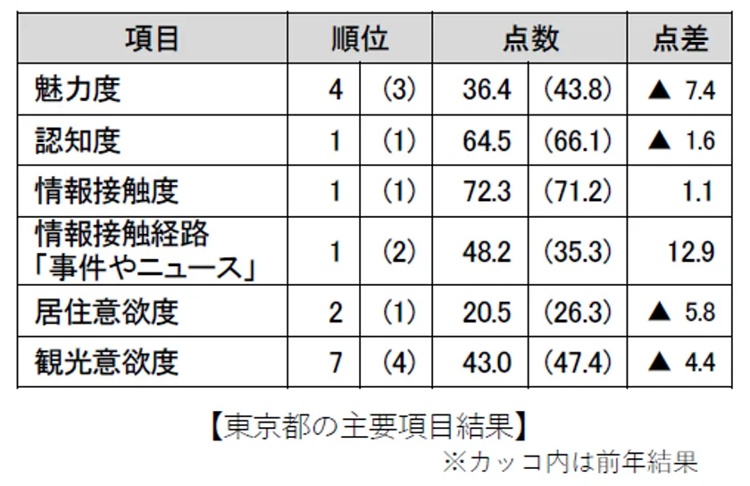 東京都は魅力度で前年3位から4位に順位を落とした。点数は前年の43.8点から36.4点に7.4ポイント低下。低下幅は47都道府県で最大となっている。