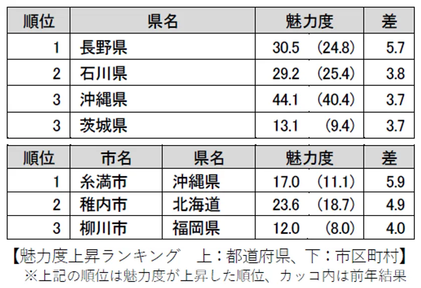 前年から魅力度が最も上昇した都道府県は長野県で、前年の24.8点(10位)から30.5点(8位)と5.7ポイント上昇。前年と比較して20代、60代の回答者の点数が上昇している。続いて石川県が3.8ポイント、沖縄県・茨城県が共に3.7ポイント上昇している。