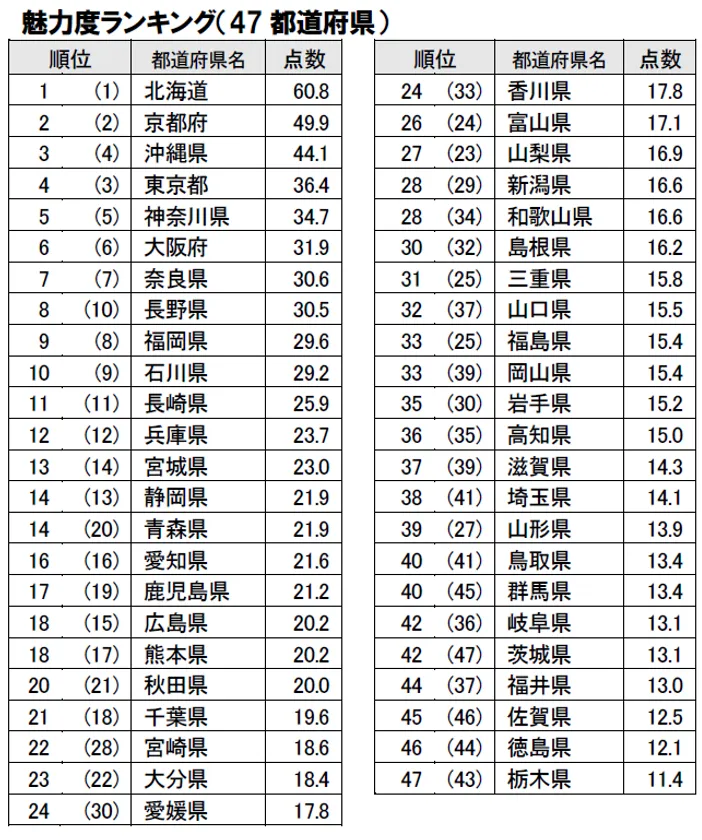 観光意欲度は47.4点(4位)から43.0点(7位)に4.4ポイント低下。居住意欲度は26.3点(1位)から20.5点(2位)に5.8ポイント低下しており、それぞれ47都道府県で最も点数が低下するという結果となっている。