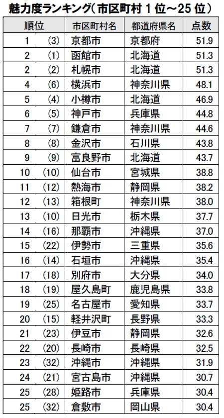 全国で最も魅力的な都道府県は12年連続で北海道となりました。市区町村は京都市が51.9点で3年ぶり3度目の1位。2位には前年1位の函館市、同2位の札幌市が同点で並んでいます。