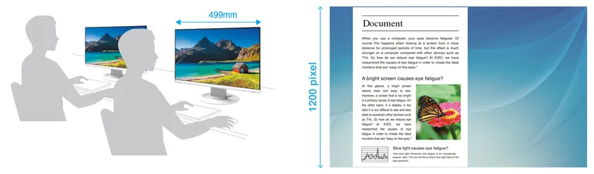 EV2360は、フレームレスデザインによる横幅500mm以下のスリム設計で、既存23型モニターと比較して40mm以上の小型化となり、教室の机上スペースを有効に活用できます。また、画面解像度はフルHDよりも縦に11%広いWUXGA(1920×1200)のため、レポート作成や電子書籍の閲覧、プログラミング授業におけるソースコード編集などの用途で、頻繁なスクロールの手間が省けます。