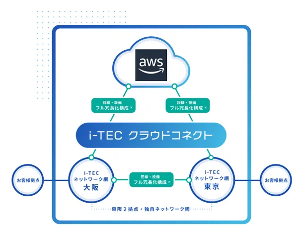 この度、アイテック阪急阪神が提供する「i-TECクラウドコネクト」は、高品質で高速、かつセキュアに、AWSとの接続を実現します。加えて、東京と大阪2拠点からの専用接続と、アイテック阪急阪神が保有するフル冗長化構成のネットワークにより、障害に強い接続が可能となります。