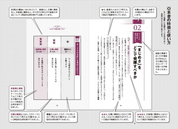 本書では、接客の現場で出くわす場面などを中心に、どう対応したらいいのか悩みがちなテーマを38項目ピックアップ。