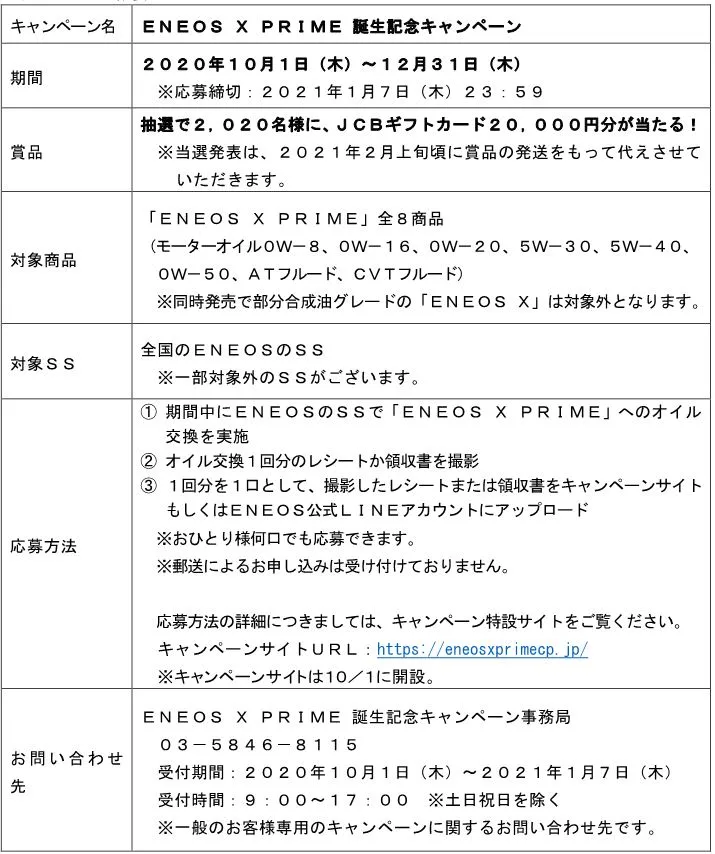 本キャンペーンでは、10月1日(木)から12月31日(木)までの間、「ENEOS X PRIME」にSSでオイル交換していただいたお客様の中から、抽選で2,020名様にJCBギフトカード20,000円分をプレゼントいたします。本キャンペーンにご参加いただくには、オイル交換後、レシート(または領収書)を写真撮影し、キャンペーン専用WEBサイトもしくはENEOS公式LINEアカウントへアップロードすることでご応募いただけます。 ぜひこの機会に、「ENEOS X PRIME」へオイル交換していただき、エンジンの騒音・振動を大幅に軽減した快適な「乗り心地」をご体感ください。