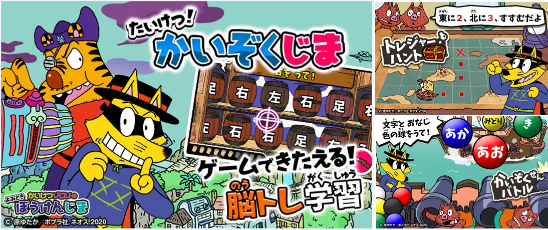 そしてこの度、従来のアトラクション型ゲーム「よみときぼうけんじま」に続き、新たに“ことば”を使った脳トレゲーム「たいけつ!かいぞくじま」をリリースいたしました。宝探しをコンセプトに、文章を読み解き宝の在りかを探す「トレジャーハント」や、ライバルキャラが放つ球の文字を正しく読んで迎撃する「かいぞくせんバトル」など、お子さまがワクワクするようなストーリー性を取り入れたコンテンツを追加しています。さらに課題をクリアするごとに「称号」が付与され、難しい問題にチャレンジ出来るといった学習意欲をかき立てるための仕組みも導入し、楽しい国語学習をサポートいたします。