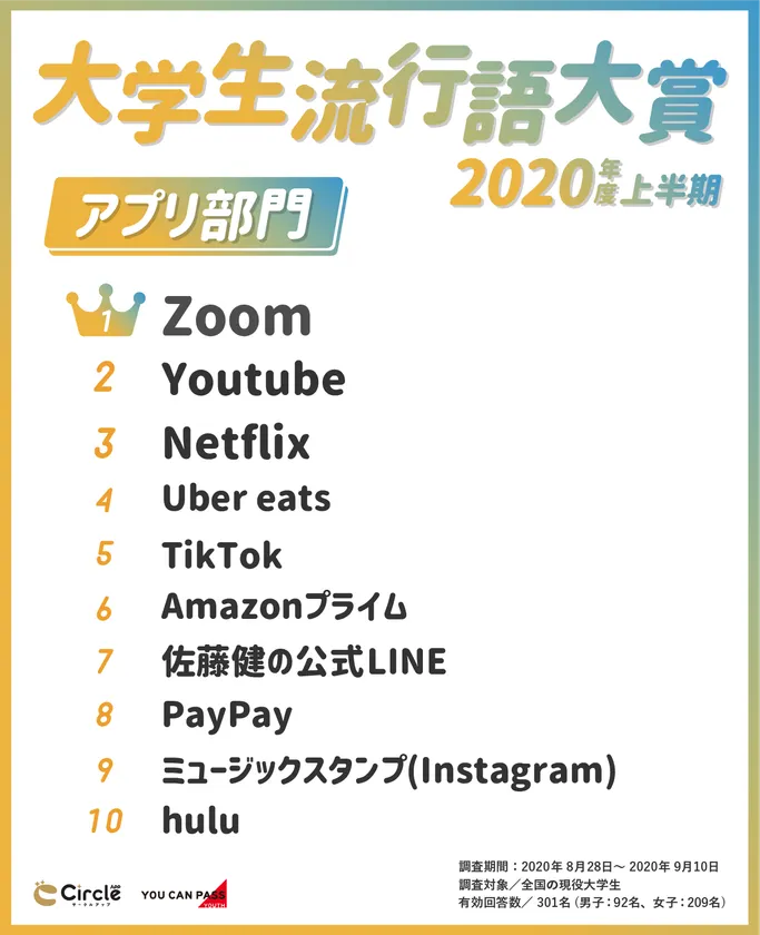大学サークルのプラットフォームアプリ「サークルアップ( https://circleapp.jp )」を運営する株式会社ユーキャンパスユース(本社:東京都港区、代表取締役会長:渡部 陽)は、サークルアップに登録する全国の現役大学生301名へのアンケートをもとに、「大学生流行語大賞2020年度上半期」を発表いたします。