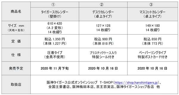毎年、多くの阪神タイガースファンにご好評頂いております「阪神タイガースカレンダー((1)壁掛けタイプ・(2)卓上タイプ・(3)卓上タイプマスコット)2021年版(3種類)」を一般発売に先駆けて、2020年10月9日(金)より、阪神タイガース公式オンラインショップT-SHOP( https://shop.hanshintigers.jp/ )および阪神タイガースカレンダー事務局( http://hcl-sportsshop.com/ )にて予約受付を開始いたします。