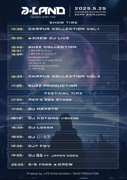 U-25 が楽しめるクラブフェス ”a-LAND”〈エーランド〉開催!渋谷のDJシーンの前線で活躍するアーティスト「TAIYO」、「MC HIKARI」や総フォロワー50万人を超える人気インフルエンサー「いーたろ」等、Z世代で構成される、最も華やかなa-LAND専属DJクルー「a-crew」による圧巻のパフォーマンスをお楽しみに。