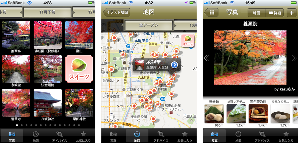 本アプリは、京都の紅葉スポットと、散策の途中で楽しみたい京都スイーツを紹介するアプリです。見頃の時期と写真から紅葉スポットを選ぶことができるほか、その周辺のスイーツスポットを写真や地図から探すことも可能です。 本アプリを利用することで、京都の美しい紅葉と、おいしいスイーツを組み合わせた散策を手軽に楽しむことができます。
