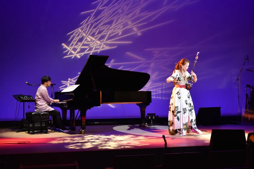 二胡奏者のトップランナーであるウェイウェイ・ウーが奏でる美しく優雅な音色。和太鼓奏者の第一人者として活躍するヒダノ修一、ダンスパフォーマンスを取り入れ、ももいろクローバーZとも毎年共演する太鼓パフォーマーの一彩(いっさい)によるパワフルなセッション。まさに、優美と躍動のコントラストが際立つ圧巻のステージとなりました。二胡と和太鼓を繋ぐ森丘ヒロキのピアノ(特に「月光」)も聞きどころです。世界最高峰・スタインウェイのグランドピアノを会場に運び入れての演奏となりました。