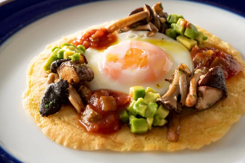 ニース風クレープ“ソッカ” フライドエッグ、茸のボルドレーズ、サルサ、アヴォカド添え