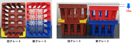 まずクレートのプラスチック使用量の削減については、クレートの積み重ねに耐えられるように垂直方向に対する強度は維持しつつ、クレートの底面を中心に軽量化を試みました。その結果、運用上影響のない強度を保持しつつ、約14%のプラスチック使用量の削減を実現させました(約95tの削減)。更に、クレートを重ねた時の高さを低くすることで、従来仕様と比較し、パレットへの積載効率が10%以上向上しました。