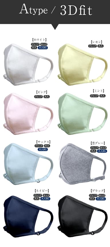 耳の近くまでワイドに隙間なくカバーし安心感がありつつも、鼻高・小顔効果のあるシルエットを研究。抗菌素材と洗練されたデザインで、清潔感がありスマートな印象になるマスクを追及しました。もちろん夏バージョンで好評だったジュニア~大人ビッグのサイズ展開は継続です。