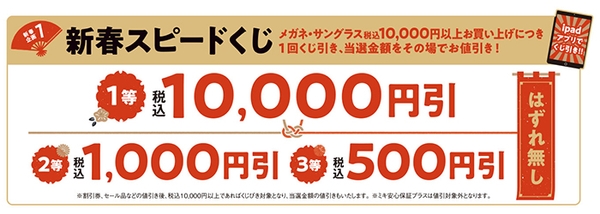 キャンペーン期間 :2023年各店初売り日~1月9日(月祝)まで キャンペーン内容:新春スピードくじ、メガネ1組最大50%コーナー ほか