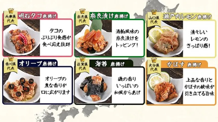北は北海道、南は九州・沖縄まで全国の食文化、特産品を活用した唐揚げとの奇跡のコラボを実現した長期イベントです。イベント期間中にご来店いただいたお客様には「ご当地唐揚げ2個(味はお選びいただけます)」をなんと「無料」でご提供致します。
