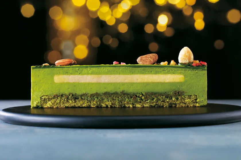 宇治抹茶スポンジとフィアンティーヌを土台に、アーモンドヘーゼルクリームを閉じ込めた宇治抹茶ショコラクリームを乗せ、宇治抹茶チョコレートでコーティングした上に、ヘーゼルナッツ、アーモンド、ドライストロベリーをあしらった『宇治抹茶ヘーゼルショコラ』。何層にも重なる宇治抹茶の味わいを余すところなくお楽しみいただけます。
